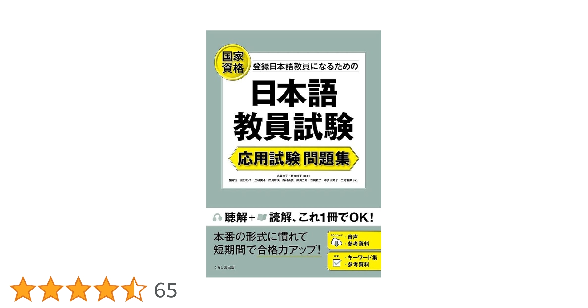 「日本語教員試験」の「応用試験」に特化した問題集。一冊で「聴解問題」も「読解問題」もカバー。本番の形式に慣れて、短期間で合格力と現場対応力アップを目指す! 巻末に「キーワード集」「参考資料一覧」付き。